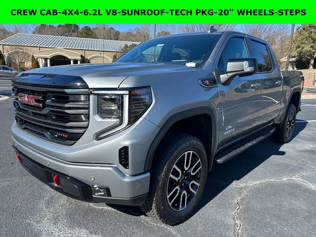 iPhone/ Android Navigation compatible, Automatic Headlights, Rearview Camera, Bluetooth, Leather, Sunroof / Moonroof, Towing Package / Hitch, Bedliner, Running Boards, Heated and Vented Front Seats, Heated 2nd Row, Heated Steering Wheel, Remote Starter System, LED Cargo Box Lighting, Bose Premium Speaker System, Mutli-function Steering Wheel, 4X4, Apple Carplay, ONSTAR, Push Button Start, Remote Keyless Entry, Andoid Auto, Premium Delivery Service Available, Sierra 1500 AT4, 4D Crew Cab, EcoTec3 6.2L V8, 10-Speed Automatic, 4WD, Sterling Metallic, Jet Black w/Kalahari Accents w/Perforated Front Leather Seat Trim, 120-Volt Interior Power Outlet, 170 Amp Alternator, 2 Charge/Data USB Ports Inside Center Console, 2 Type-C Charge-Only Rear USB Ports, 2 USB Ports, 3.23 Rear Axle Ratio, Apple CarPlay/Android Auto, AT4 Preferred Package, AT4 Premium Package, Auto-Locking Rear Differential, Automatic temperature control, Bed View Camera, Black Chrome Grille Insert Bars, Deep-Tinted Glass, Electric Rear-Window Defogger, Emergency communication system: OnStar, Floor-Mounted Center Console, Following Distance Indicator, Forward Collision Alert, Front dual zone A/C, Front Pedestrian Braking, Front Rain-Sensing Wipers, HD Surround Vision, Heated 2nd Row Outboard Seats, Heated front seats, Heated rear seats, Heated steering wheel, Heavy-Duty Air Filter, Hill Descent Control, Hitch Guidance, Hitch View, Integrated Trailer Brake Controller, LED Cargo Area Lighting, Low tire pressure warning, Multicolor 15 Diagonal Head-Up Display, Navigation System, OnStar Services Capable, Perforated Front Leather Seat Trim, Perimeter Lighting, Power Door Locks, Power driver seat, Power passenger seat, Power Sunroof, Preferred Equipment Group 4SB, Premium Bose 7-Speaker Sound System, Push Button Start, Rain sensing wipers, Rear Camera Mirror, Rear Cross Traffic Braking, Rear Pedestrian Detection, Rear Wheelhouse Liners, Red Recovery Hooks, Remote keyless entry, Remote Vehicle Starter System, Safety Alert Seat, Steering Wheel Audio Controls, Technology Package, Trailer Camera Provisions, Trailer Side Blind Zone Alert, Trailering Package, Universal Home Remote, Vent Price does not include State/County/Local Tax, Tag, GA Lemon Law or Registration fees. Dealer administrative fee of $489 is included in the price. We offer electronic tag and title as an option for additional fee (this fee is based on what your state/county charge to participate as well as a fee to the company we select to process). A fee may be charged to customers wishing to have vehicle delivered. While we make every effort to ensure the data listed here is correct, there may be instances where some of the factory rebates, incentives, options or vehicle features may be listed incorrectly as we get data from multiple data sources. PLEASE MAKE SURE to confirm the details of this vehicle (such as what factory rebates you may or may not qualify for based on your residence/employment/financing) with the dealer to ensure its accuracy. Dealer can not be held liable for data that is listed incorrectly. You may also qualify for $1750 - Buick & GMC Consumer Cash Program. Exp. 03/31/2026 $3500 - GM Trade In Allowance Program. Exp. 03/31/2026 $500 - Buick GMC Bonus Cash. Exp. 03/31/2026 $500 - GM Rewards Card Sales Sign Up and Spend Offer. Exp. 06/30/2026 Savings applied to everyone. Offer includes up to $1500 finance assistance. Not available with special financing, lease and select othe