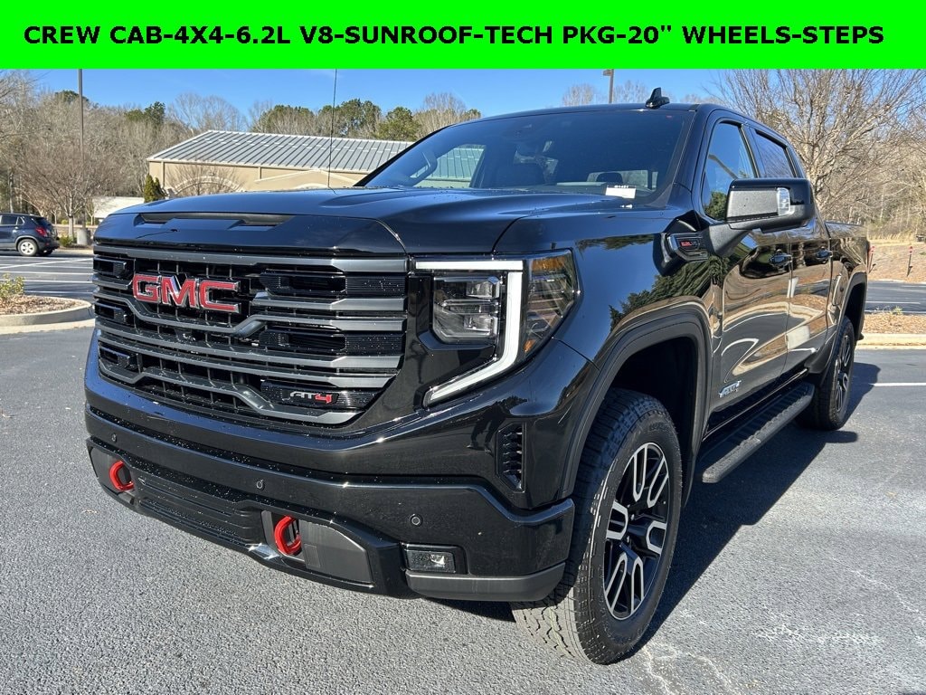 iPhone/ Android Navigation compatible, Automatic Headlights, Rearview Camera, Bluetooth, Leather, Sunroof / Moonroof, Towing Package / Hitch, Bedliner, Running Boards, Heated and Vented Front Seats, Heated 2nd Row, Heated Steering Wheel, Remote Starter System, LED Cargo Box Lighting, Bose Premium Speaker System, Mutli-function Steering Wheel, 4X4, Apple Carplay, ONSTAR, Push Button Start, Remote Keyless Entry, Andoid Auto, Premium Delivery Service Available, Sierra 1500 AT4, 4D Crew Cab, EcoTec3 6.2L V8, 10-Speed Automatic, 4WD, Onyx Black, Jet Black w/Kalahari Accents w/Perforated Front Leather Seat Trim, 120-Volt Bed Mounted Power Outlet, 120-Volt Interior Power Outlet, 170 Amp Alternator, 2 Charge/Data USB Ports Inside Center Console, 2 Type-C Charge-Only Rear USB Ports, 2 USB Ports, 3.23 Rear Axle Ratio, Apple CarPlay/Android Auto, AT4 Preferred Package, AT4 Premium Package, Auto-Locking Rear Differential, Automatic temperature control, Bed View Camera, Black Chrome Grille Insert Bars, Deep-Tinted Glass, Electric Rear-Window Defogger, Emergency communication system: OnStar, Floor-Mounted Center Console, Following Distance Indicator, Forward Collision Alert, Front dual zone A/C, Front Pedestrian Braking, Front Rain-Sensing Wipers, HD Surround Vision, Heated 2nd Row Outboard Seats, Heated Driver & Front Outboard Passenger Seating, Heated front seats, Heated rear seats, Heated steering wheel, Heavy-Duty Air Filter, Hill Descent Control, Hitch Guidance, Hitch View, In-Vehicle Trailering System App, Integrated Trailer Brake Controller, Keyless Open & Start, Lane Keep Assist w/Lane Departure Warning, LED Cargo Area Lighting, Low tire pressure warning, Multicolor 15 Diagonal Head-Up Display, Navigation System, Off-Road High Clearance Step (LPO), OnStar Services Capable, Perforated Front Leather Seat Trim, Perimeter Lighting, Power Door Locks, Power driver seat, Power Front Passenger Windows w/Express Up/Down, Power Front Windows w/Driver Express Up/Down, Power passenger seat, Power Rake & Telescoping Steering Column, Power Rear Windows w/Express Down, Power Sliding Rear Window w/Rear Defogger, Power Sunroof, Preferred Equipment Group 4SB, Pre Price does not include State/County/Local Tax, Tag, GA Lemon Law or Registration fees. Dealer administrative fee of $489 is included in the price. We offer electronic tag and title as an option for additional fee (this fee is based on what your state/county charge to participate as well as a fee to the company we select to process). A fee may be charged to customers wishing to have vehicle delivered. While we make every effort to ensure the data listed here is correct, there may be instances where some of the factory rebates, incentives, options or vehicle features may be listed incorrectly as we get data from multiple data sources. PLEASE MAKE SURE to confirm the details of this vehicle (such as what factory rebates you may or may not qualify for based on your residence/employment/financing) with the dealer to ensure its accuracy. Dealer can not be held liable for data that is listed incorrectly. You may also qualify for $1750 - Buick & GMC Consumer Cash Program. Exp. 02/02/2026 $3500 - GM Trade In Allowance Program. Exp. 02/02/2026 $500 - GM Bonus Cash. Exp. 02/02/2026 $500 - GM Rewards Card Sales Sign Up and Spend Offer. Exp. 06/30/2026 Savings applied to everyone. Offer includes up to $1500 finance assistance. Not available with special financing, lease and select othe