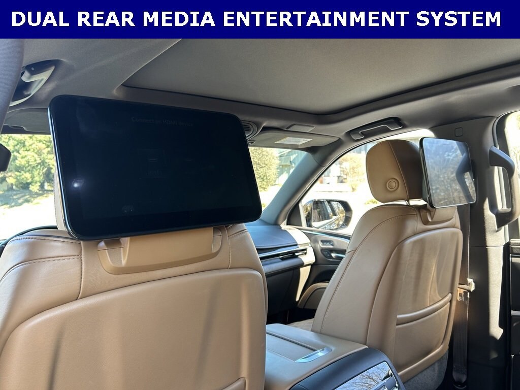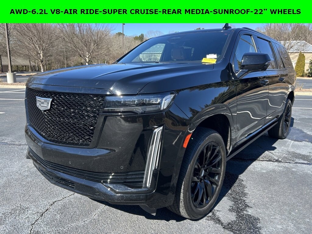 iPhone/ Android Navigation compatible, Automatic Headlights, Rearview Camera, Bluetooth, Leather, 1 Owner, Sunroof / Moonroof, Rear DVD Entertainment System, Towing Package / Hitch, Running Boards, Heated and Vented Front Seats, Heated 2nd Row, Heated Steering Wheel, Remote Starter System, Mutli-function Steering Wheel, 4X4, Includes the Remainder of the Factory Warranty, Extended Warranty Available, Apple Carplay, ONSTAR, 3rd Row Seats, Push Button Start, Remote Keyless Entry, Andoid Auto, Premium Delivery Service Available, Escalade ESV Sport, 4D Sport Utility, 6.2L V8, AWD, Black Raven, Brandy w/Very Dark Atmosphere Accents w/Full Leather Seats w/Faceted Quilting, 16.9 Diagonal OLED Infotainment Screen, 3.23 Axle Ratio, Adaptive Cruise Control, Air Ride Adaptive Suspension, AKG Studio 19-Speaker Audio System, Apple CarPlay/Android Auto, Automatic Seat Belt Tightening, Automatic temperature control, Body-Color Door Handles, Door Lock & Latch Shields, Electronic Limited-Slip Differential, Emergency communication system: OnStar and Cadillac connected services capable, Enhanced Automatic Emergency Braking, Enhanced Automatic Parking Assist, Exterior Parking Camera Rear, Front Bucket Seats, Front dual zone A/C, Glass Breakage Sensor, Gloss Black Escalade Nameplate (LPO), HD Radio, Heads-Up Display, Heated & Ventilated Driver & Front Passenger Seats, Heated Driver & Front Passenger Seats, Heated front seats, Heated rear seats, Heated steering wheel, Hitch Guidance w/Hitch View, Illuminating Front & Rear Sill Plates, Integrated Trailer Brake Controller, Leather Seating Surfaces w/Precision Perf Inserts, Low tire pressure warning, Monochrome Cadillac Emblems (LPO), Navigation System, Onyx Package (LPO), Power driver seat, Power Liftgate, Power moonroof, Power Panoramic Tilt-Sliding Sunroof, Power passenger seat, Power windows, Power-Retractable Assist Steps, Preferred Equipment Group 1SC, Puddle Lamps w/Cadillac Crest (LPO), Radio: AM/FM w/Navigation, Rain sensing wipers, Rear air conditioning, Rear anti-roll bar, Rear Camera Mirror, Rear Camera Mirror Washer, Rear Cross Traffic Alert, Rear Seat Entertainment System, Reconfigurable Full-Color Head-Up Display, Remote keyless entry, Reverse Automatic Braking, Running Board Assist Steps, SiriusXM w/360L, Smart Trailer Integration Indicator, Soft Closing Front & Rear Doors, Super Cruise, Teen Driver, Theft-Deterrent Alarm System, Touring Package, Trailer Side Blind Zone Alert, Vehicle Inclination Sensor, Vehicle Interior Movement Sensor, Ventilated front seats, Wheels: 22 12-Spoke Gloss Black Alloy (LPO), Wireless Apple CarPlay/Wireless Android Auto.