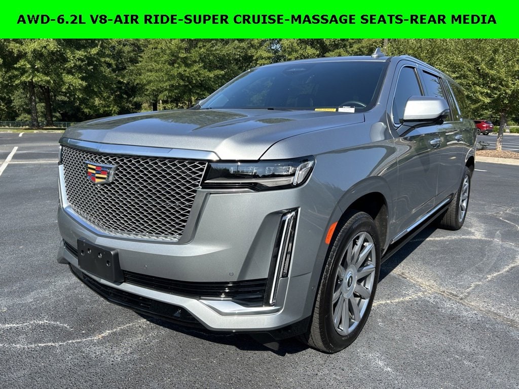 iPhone/ Android Navigation compatible, Automatic Headlights, Rearview Camera, Bluetooth, Leather, Clean History Report!, 1 Owner, Sunroof / Moonroof, Rear DVD Entertainment System, Towing Package / Hitch, Running Boards, Heated and Vented Front Seats, Heated 2nd Row, Heated Steering Wheel, Remote Starter System, Mutli-function Steering Wheel, 4X4, Includes the Remainder of the Factory Warranty, Extended Warranty Available, Apple Carplay, ONSTAR, 3rd Row Seats, Push Button Start, Remote Keyless Entry, Andoid Auto, Premium Delivery Service Available, TINT, Escalade ESV Premium Luxury Platinum, 4D Sport Utility, 6.2L V8, 10-Speed Automatic, AWD, Argent Silver Metallic, Jet Black w/Full Semi-Aniline Leather Seats w/Mondrian Quilt, 16.9 Diagonal OLED Infotainment Screen, 2-Speed Active Transfer Case, 3.23 Axle Ratio, Adaptive Cruise Control, Air Ride Adaptive Suspension, AKG Studio Reference 36-Speaker Audio System, Apple CarPlay/Android Auto, Automatic Seat Belt Tightening, Automatic temperature control, Door Lock & Latch Shields, Electronic Limited-Slip Differential, Emergency communication system: OnStar and Cadillac connected services capable, Enhanced Automatic Emergency Braking, Enhanced Automatic Parking Assist, Exterior Parking Camera Rear, Extra Capacity Cooling System, Floor Console w/Covered Storage, Front dual zone A/C, Full Semi-Aniline Leather Seat Trim, Glass Breakage Sensor, HD Radio, Heads-Up Display, Heated & Ventilated Driver & Front Passenger Seats, Heated Driver & Front Passenger Seats, Heated front seats, Heated rear seats, Heated steering wheel, Heavy-Duty Trailering Package, Hitch Guidance w/Hitch View, Integrated Trailer Brake Controller, Leather steering wheel, Low tire pressure warning, Navigation System, Night Vision, Platinum Interior Trim, Power driver seat, Power Liftgate, Power Lumbar Massage Driver Seat, Power Lumbar Massage Front Passenger Seat, Power moonroof, Power Panoramic Tilt-Sliding Sunroof, Power passenger seat, Power-Retractable Assist Steps, Preferred Equipment Group 1SG, Radio: AM/FM w/Navigation, Rain sensing wipers, Rear air conditioning, Rear anti-roll bar, Rear Camera Mirror, Rear Camera Mirror Washer, Rear Cross Traffic Alert, Rear Seat Entertainment System, Rear window defroster, Reconfigurable Full-Color Head-Up Display, Remote keyless entry, Reverse Automatic Braking, Running Board Assist Steps, SiriusXM w/360L, Smart Trailer Integration Indicator, Teen Driver, Theft-Deterrent Alarm System, Touring Package, Trailer Side Blind Zone Alert, Trailer Tire Pressure Monitoring System, Trailering Assist Guidelines, Vehicle Inclination Sensor, Vehicle Interior Movement Sensor, Ventilated front seats, Wheel Locks, Wheels: 22 10-Spoke Polished Alloy, Wired Auxiliary Trailer Camera (LPO), Wireless Apple CarPlay/Wireless Android Auto.