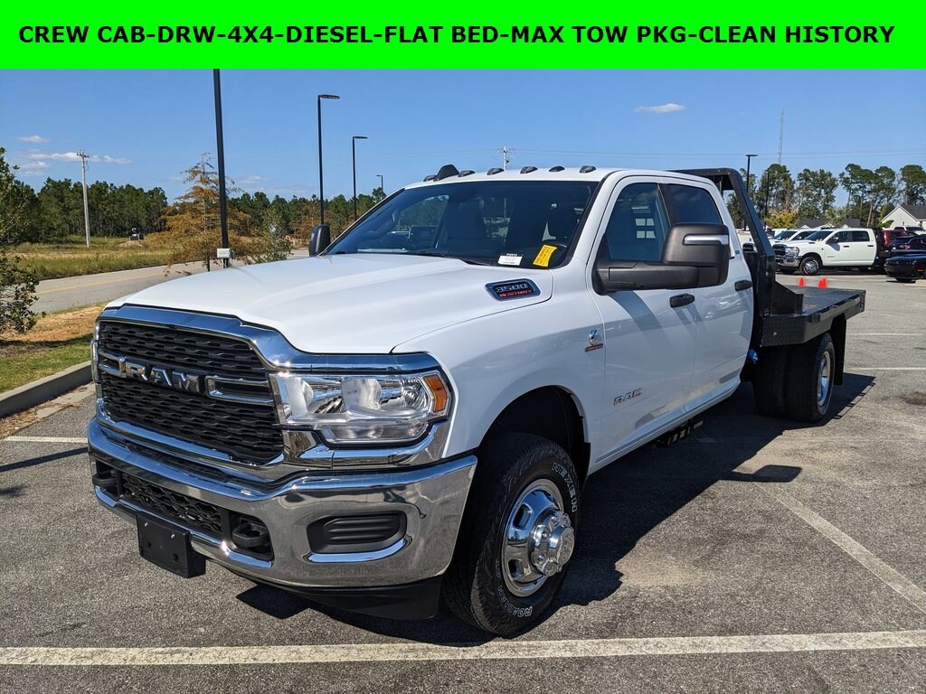 One Owner, Clean Autocheck / No Accidents, Extended Warranty Available, Bluetooth / Hands-free, Back-Up Camera w/ Guidelines, Cruise Control, Portable Audio Connection, Premium Wheels, Multi-function Steering Wheel, Trailer Hitch, 4x4/4WD, *Premium Delivery Service Available*, FLAT BED, 3500 SLT, 4D Crew Cab, Cummins 6.7L I6 Turbodiesel, Aisin 6-Speed Automatic, 4WD, Bright White Clearcoat, Diesel Gray/Black w/Cloth 40/20/40 Bench Seat or Premium Cloth 40/20/40 Bench Seat or HD Vinyl 40/20/40 Split Bench Seat or Premium Cloth Bucket Seats, 11.50 Dual Wheels Rear Axle, 12.0 Dual Wheel Rear Axle, 2 Way Rear Headrest Seat, 4 Way Front Headrests, 4.10 Axle Ratio, 40/20/40 Split Bench Seat, 6000# Front Axle w/Hub Ext, Acoustic Front Door Glass, Add 4.10 Axle Ratio, Black-Out Tape, Body Insulation, Bright Front Bumper, Chrome Grille Surround, Chrome Headlamp Bezels, Chrome Nostrils/Molded in Color Black Grille, Cloth 40/20/40 Bench Seat, Cloth 40/20/40 Bench Seat w/2_G, Door Sill Scuff Pads, Dual Rear Wheels, Emergency communication system: SiriusXM Guardian, Floor Covering Carpet, For Details, Visit DriveUconnect.com, For More Info, Call 800-643-2112, Front Armrest w/Cupholders, Glove Box, Halogen Quad Headlamps, Integrated Voice Command w/Bluetooth, Map/Courtesy Lamp, Max Tow Package, Overhead Console, Overhead Cupholder Lamp, Painted I/P Bezels w/Hydrographics, Passenger Sun Visor w/Illuminated Mirror, Premium Vinyl Door Trim w/Map Pocket, Quick Order Package 2YG SLT, Radio: Uconnect 3 w/5 Display, RAM Door Badges, Rear anti-roll bar, Rear Dome Lamp, Rear Folding Seat, Remote Keyless Entry, Satin Chrome Key Fob, SLT Badge, Tinted Acoustic Windshield Glass, Tow Hooks, Traveler/Mini Trip Computer, Wheels: 17 x 6.0 Steel Chrome Clad.